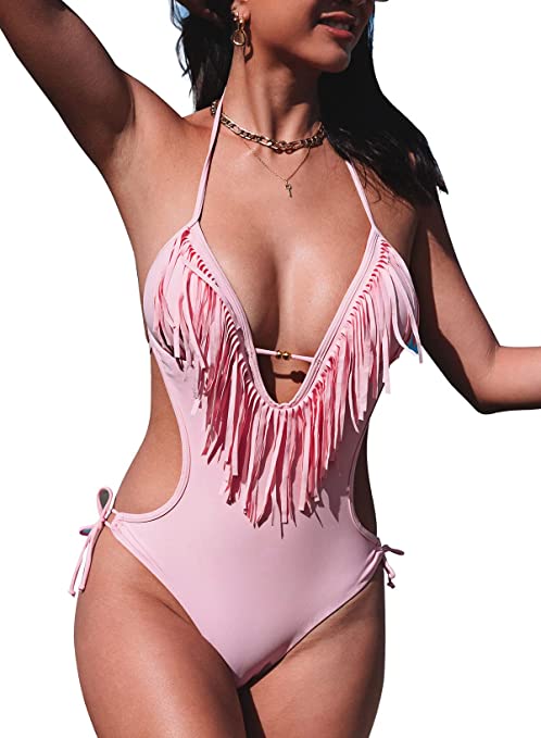 Herseas Tassel One Piece Swimsuits for Women Deep V Neck Halter Bathing Suits Lace Up Backless Sexy Swimwear
