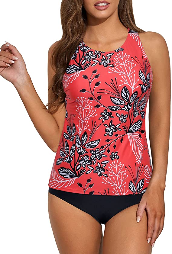The high neck tankini with a moderate bottom provides full coverage, modest but still flattering, which is great for a beach vacation or a swimming pool party.