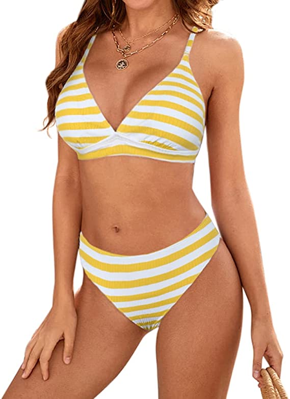 AVOVER Classic Striped Triangle Bikini Sets for Women Mid Waisted Swimsuit Two Piece Hook Back Sexy Bathing Suit