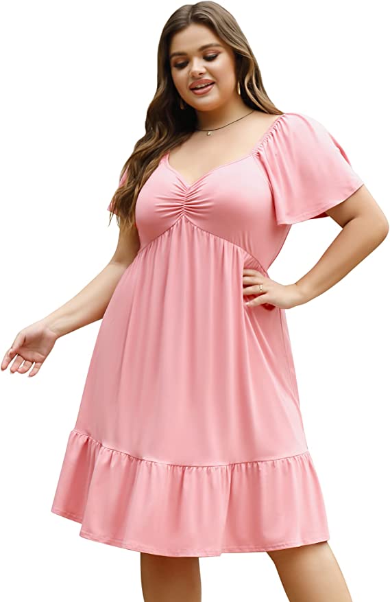 AMZ PLUS Women Plus Size Dress Solid Mini Short Sleeve Sweetheart Neck Ruffle Hem Dress