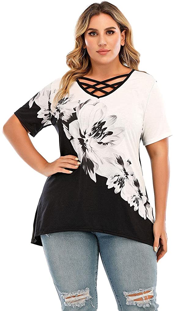 LAPA Women Plus Size Floral Tee Tunic Tops, Criss Cross v Neck T-Shirt Loose
