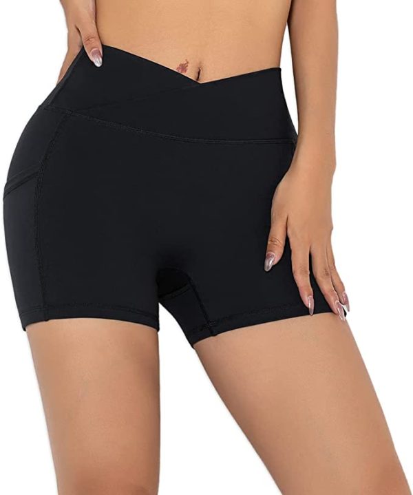 Darkterror Workout Shorts Women Spandex High Crossover Waist Gym Athletic Yoga Running with Pockets