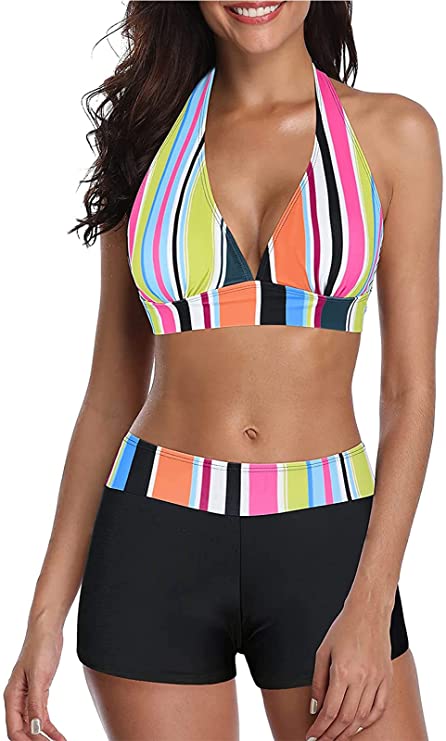 - Halter V Neck, Padded Top, Built-in Sports Bra, High Elasticity Boyleg Bottom.