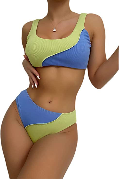 SheIn Women’s 2 Piece Swimsuit Color Block Tank Top and High Waist Panty Bikini Set Bathing Suit