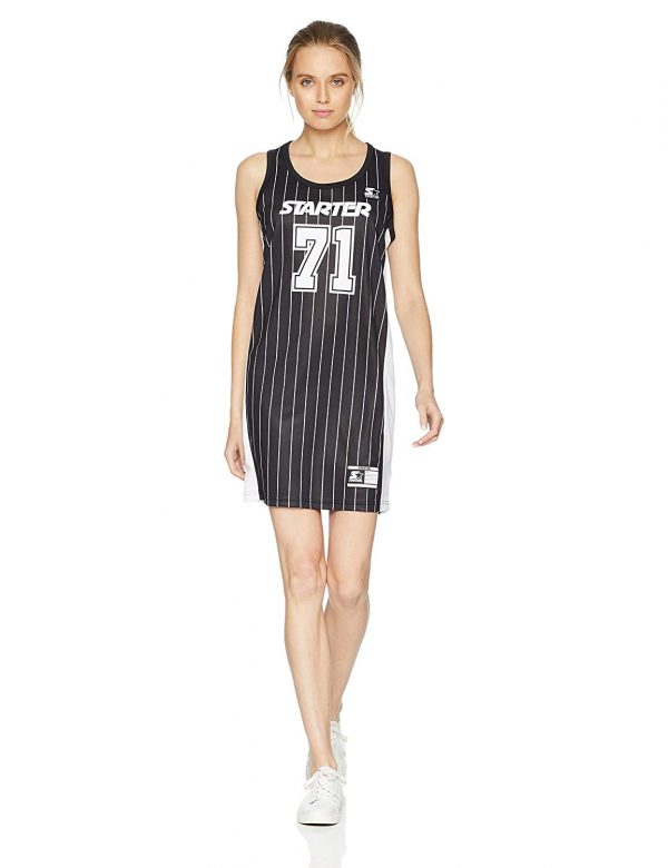 This basketball jersey tank dress features a classic silhouette with embroidered patch logos, a jock tag, and vertical stripes for authentic style