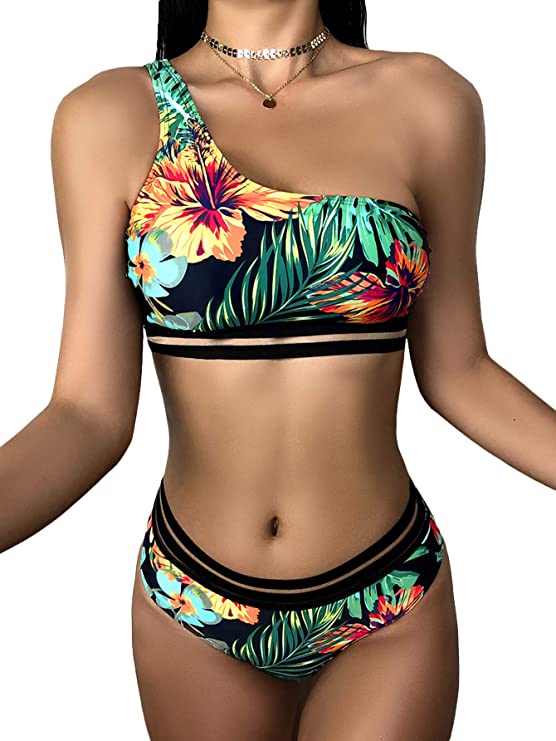 Romwe Women’s Boho Tropical Print Tape One Shoulder 2 Piece Bikini Swimsuit