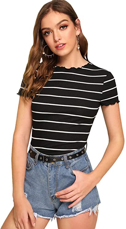 Milumia Women’s Casual Multi Striped Ribbed Short Sleeve Slim Fit Tee Knit Top