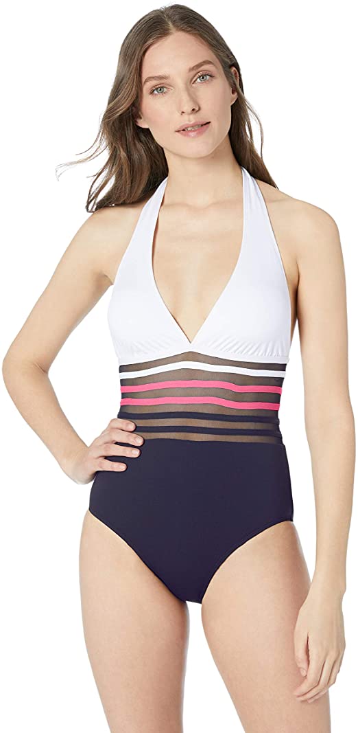 Look your best in and out of the water with our Nautica color-blocked peek-a-boo mesh one piece swimsuit