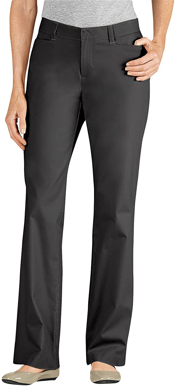 Dickies misses midrise spandex stretch slim straight pant in a seven ounce twill fabric features a contoured waistband with interlining to prevent gapping in back. Hook and eye closure provides a smooth clean front along with two front l-shaped pockets. Two back welt pockets. Built by Dickies, crafted for women.