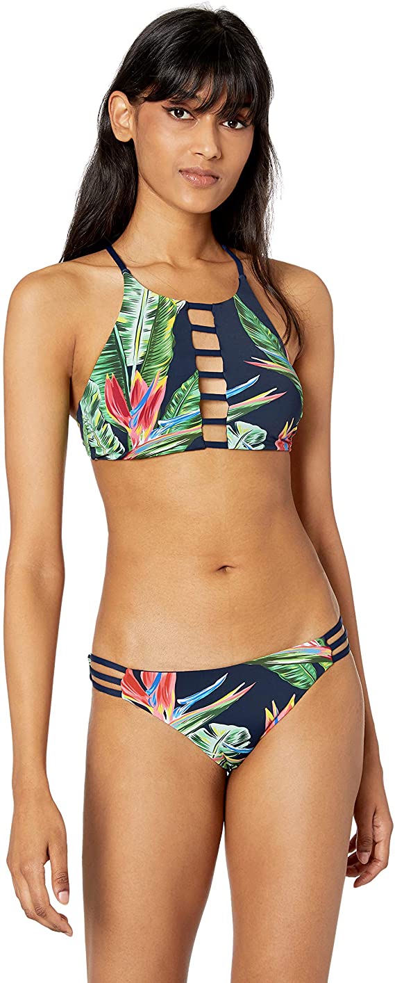 YDX eagle beach two piece fashion reversible 2 in 1 swimsuit collection in floral, tropical and palm tree printed patterns. Juniors women’s and plus size swim costume with sexy weaved straps on top and bottom. Modest yet sexy and flattering medium coverage bikini.