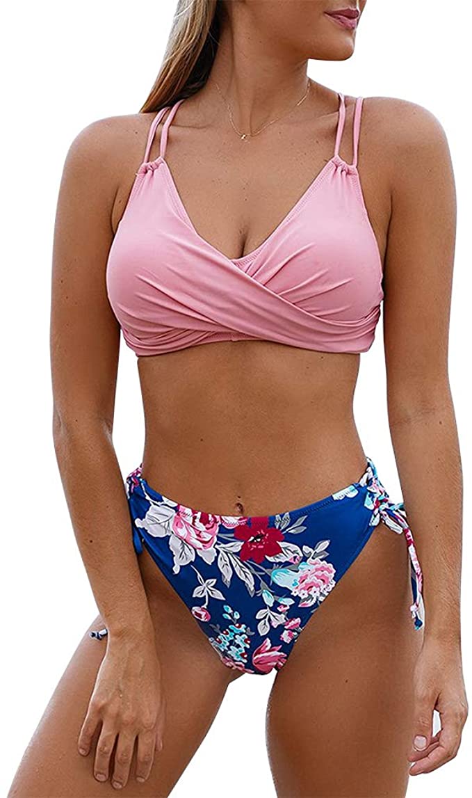 - Strappy V Neck Halter Floral 2 Pieces Bathing Suit for Women