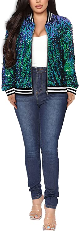 Womens Long Sleeve Sequin Open Front Zipper Jacket with Ribbed Cuffs