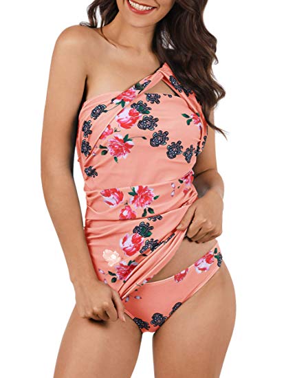 Women’s One Shoulder Swimsuit Two Piece Ruched Tankini Floral Tummy Control Bikini Set