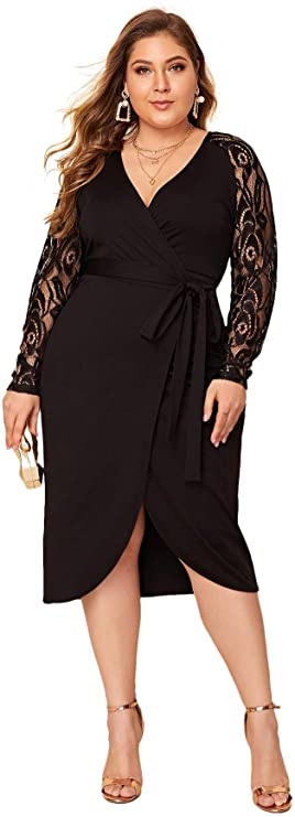SheIn Women’s Plus Elegant Contrast Lace Sleeve Self Belted Wrap Stretchy Bodycon Pencil Dress