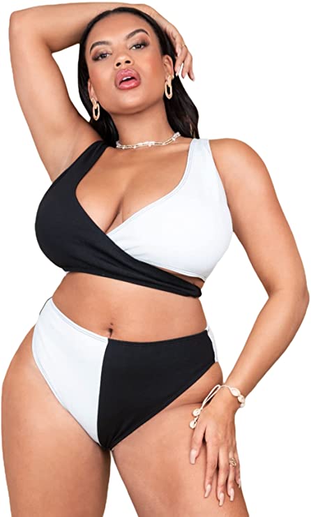 MakeMeChic Women’s Plus Size 2 Piece Bathing Suit Color Block Cross Wrap Bikini Swimsuit