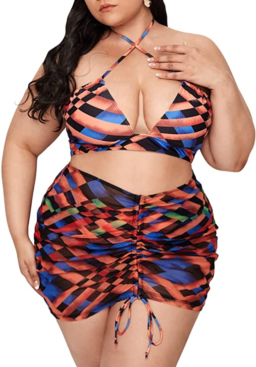 Romwe Women’s Plus Size 3 Piece Bikini Set Plaid Halter Bikini Swimsuit with Beach Skirt