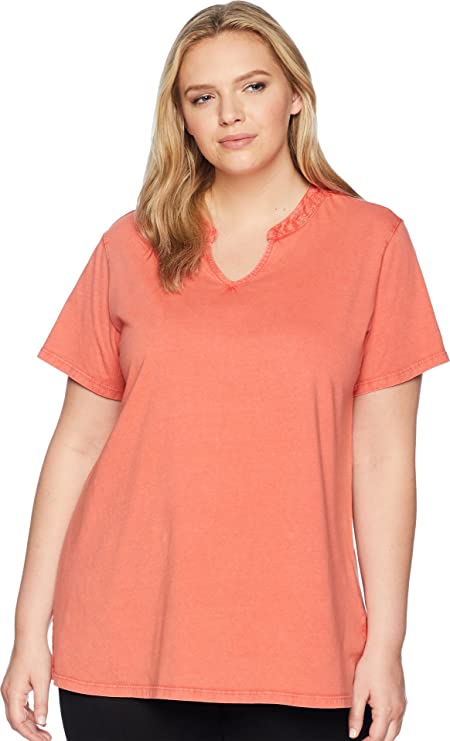 You will love the soft feel, washed down colors and fit of the casia top. She has short sleeves and an attractive slight v neck design.