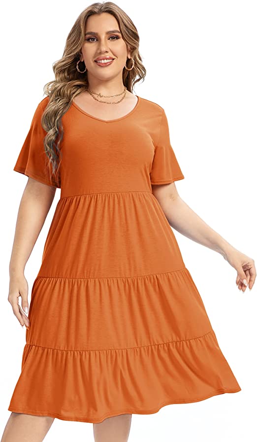 AMZ PLUS Women’s Plus Size Casual Dress Lantern Sleeve Ruffle Hem V Neck Loose Swing Tunic Mini Dress