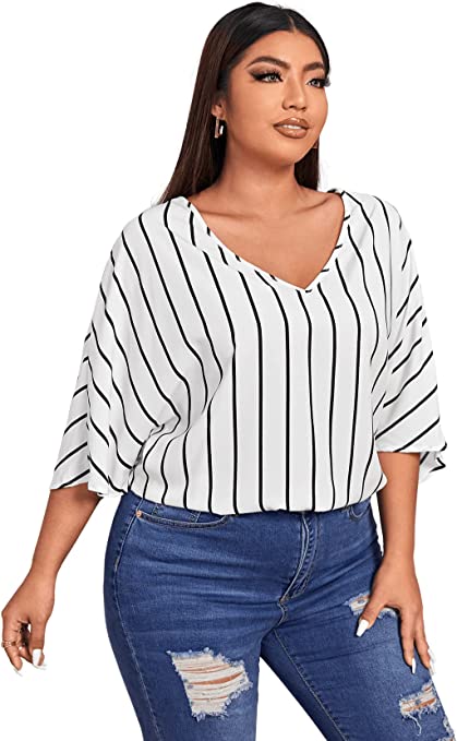Romwe Women’s Plus Size Casual Striped Print Short Sleeve V Neck Work Blouse Top Shirt