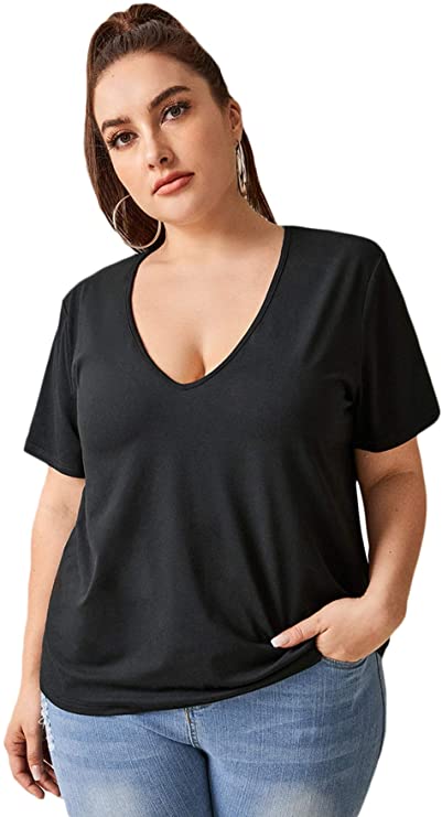 SheIn Women’s Plus Size Deep V Neck Short Sleeve T Shirt Solid Basic Tee Tops