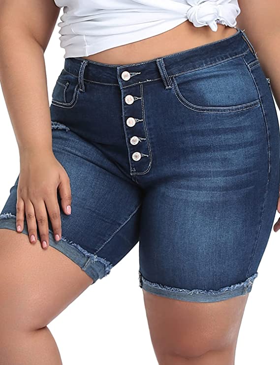 - High waited destroyed denim shorts for a curvier look. Classic five-pockets styling with a zip fly and 2 button closures.