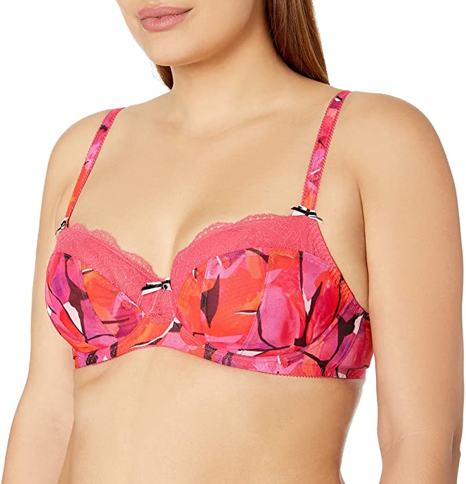 Feel the attraction of hot house, an abstract petal print paired with hot pink lace.