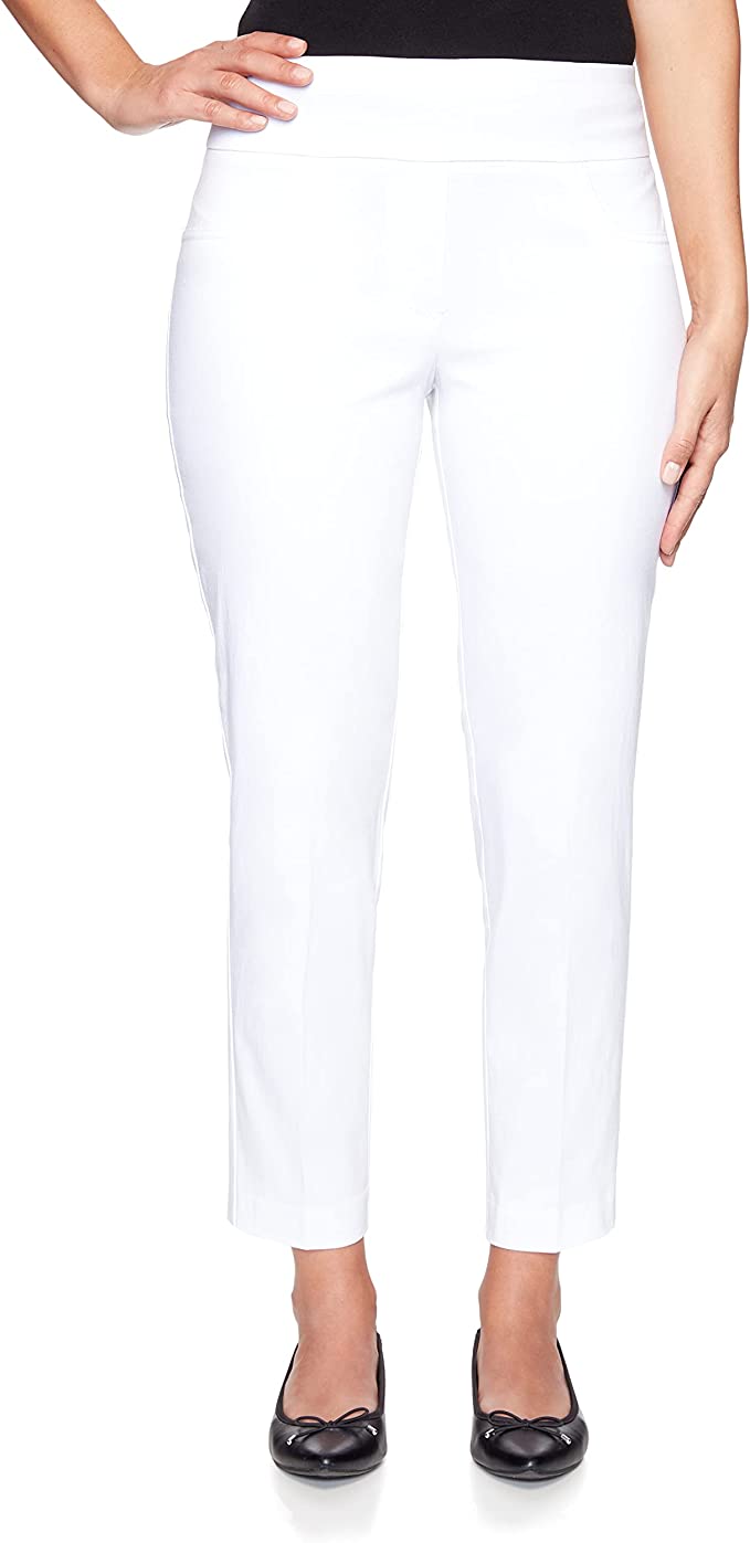 Our slim fit pull-on solar millenium tech women’s ankle pant will add comfort and style to your wardrobe. This pleated pant has a wide contour waistband, faux front and back pockets, and a straight leg fit.