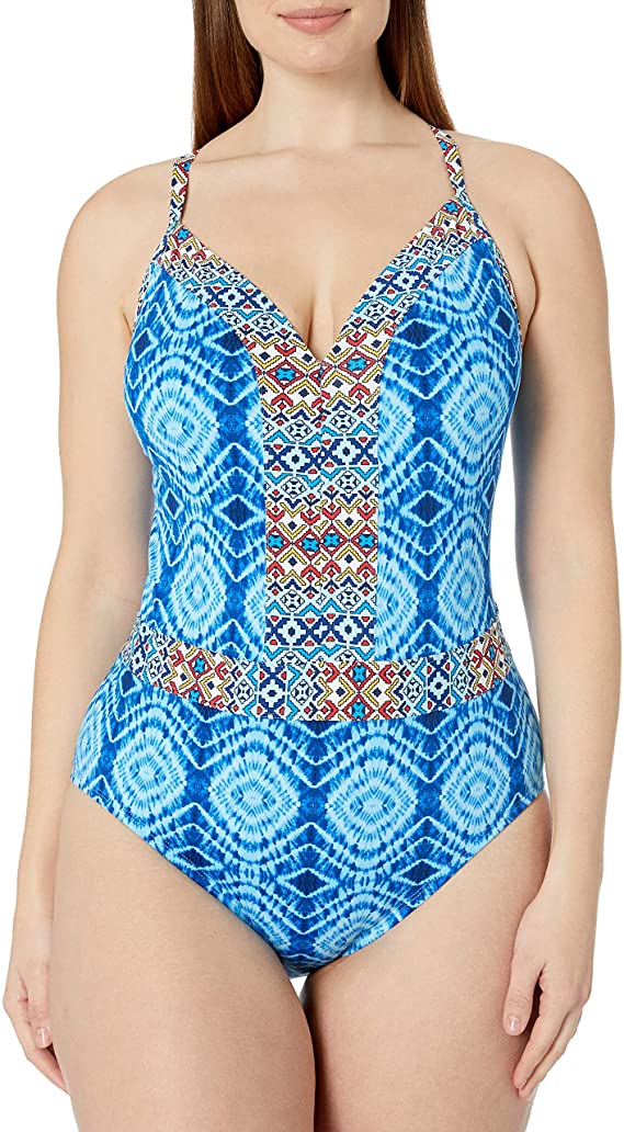 Plus-Size mykonos printed plunge cross back mio one piece swimsuit from Bleu Rod Beattie.