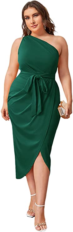 MakeMeChic Women’s Plus Size One Shoulder Belted Wrap High Waist Midi Dress