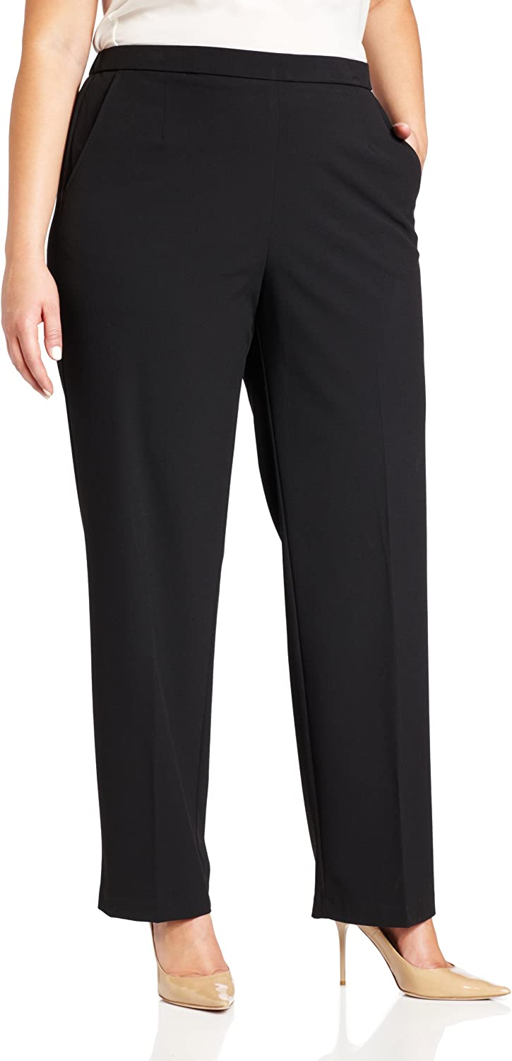 Straight-leg pant with flat front featuring creased leg and elasticized waist at back