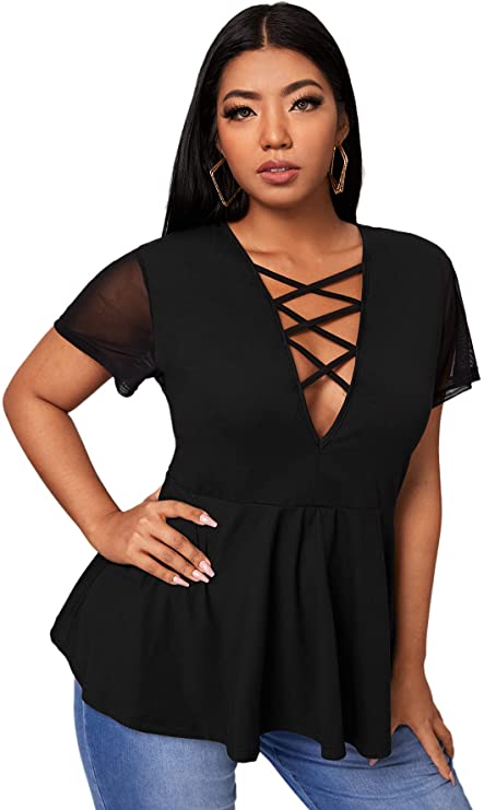 SOLY HUX Women’s Plus Size Sexy Criss Cross V Neck Short Sleeve Babydoll Peplum Top Blouse Shirts