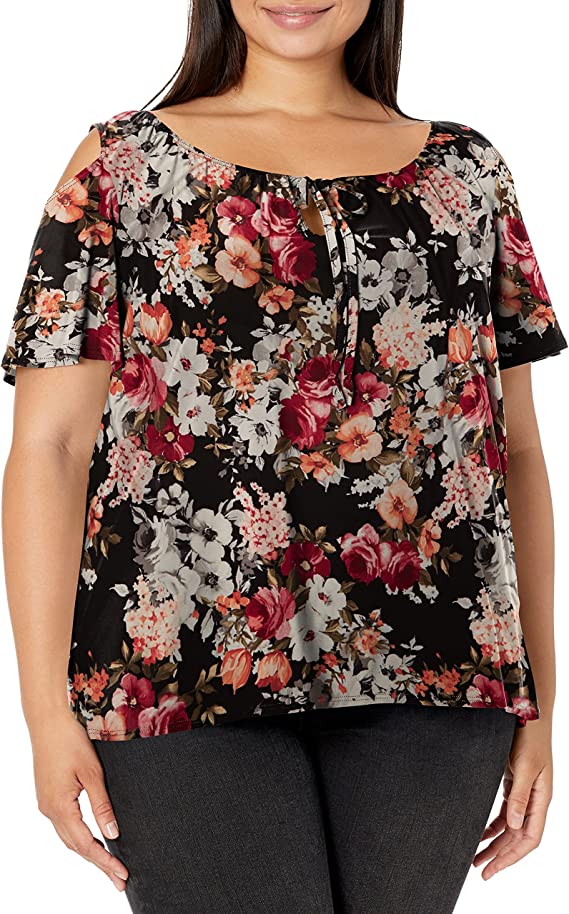 Plus-size short sleeve cold-shoulder keyhole tie neck elastic yoke bestselling stretch ITY knit top