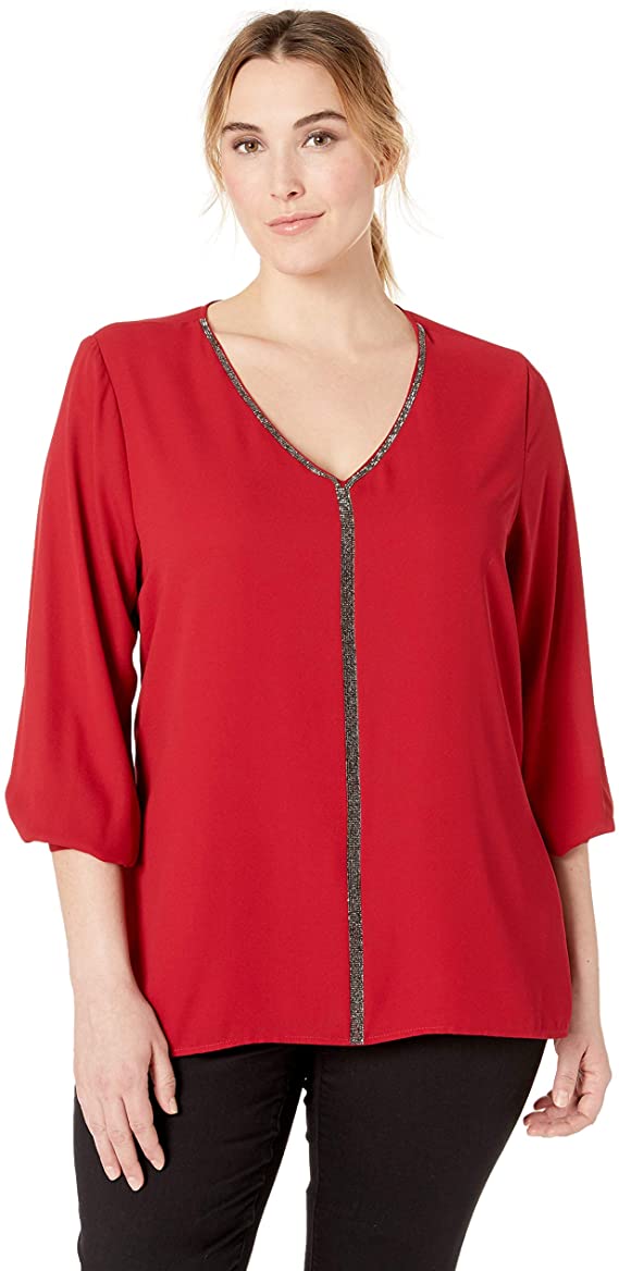 Silky crepe, sparkle trim, long sleeve with cuff, relaxed fit