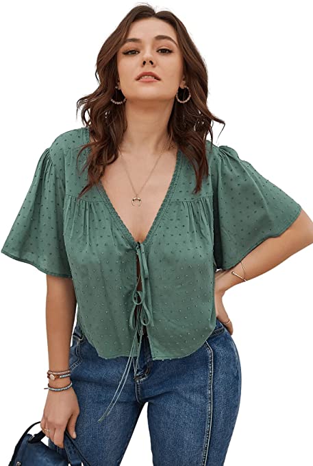 Floerns Women’s Plus Size Swiss Dots Self Tie V Neck Short Sleeve Crop Tops