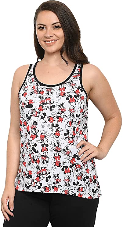 Disney plus size tank top with Mickey and Minnie Mouse all-over print – officially licensed. This sleeveless tee is great for Disney parks, the beach, and other summer fun, but it is also great for sleep wear. It is 62% polyester/38% polyester. The fabric is lightweight and slightly sheer. Machine wash with like colors and tumble dry low.