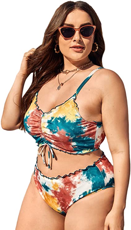 Floerns Women’s Plus Size Tie Dye Rib Knit Ruched Drawstring Bikini Swimsuit