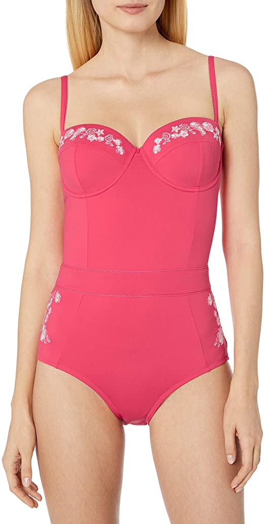 Johnny Was swimwear. “Villanelle corset one piece”. Red corset one piece swimsuit with adjustable straps and tonal floral embroidery detail.