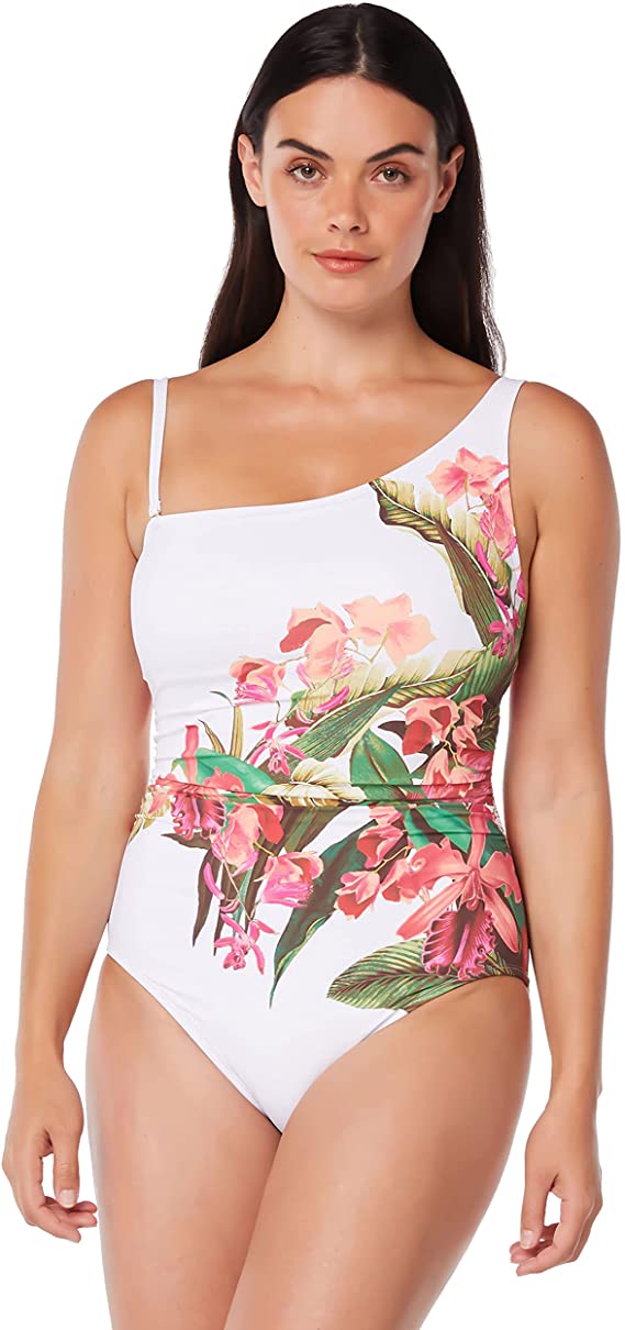The Bleu Rod Beattie Return To Rio One Shoulder One Piece Swimsuit RR22766 has wire-free cups with removable padding, asymmetrical neckline, and bright floral print. Removable strap gives more support. Bleu Rod Beattie’s Return To Rio One Shoulder One Piece Swimsuit is made of nylon/polyester/spandex.