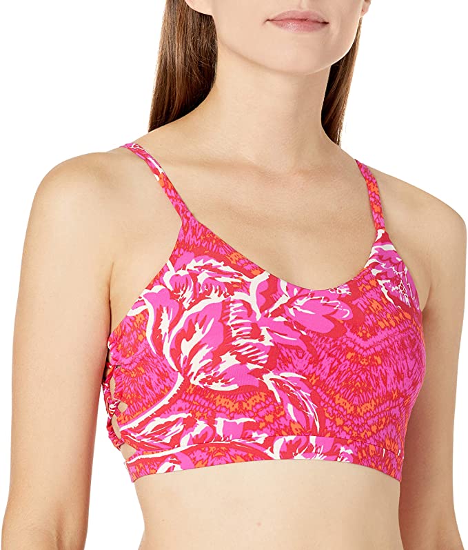You’ll feel and look amazing in your next workout wearing Idyllic Dandelion Rouge sports bra. This medium impact bra provides lift and support while making you look great. It has a round neckline, open back, and sexy lace-up sides. A floral pattern decorates the outside of this sports bra but, you can reverse it to a solid color for an entirely different look. Pair it with other pieces in the Dance it Out collection.