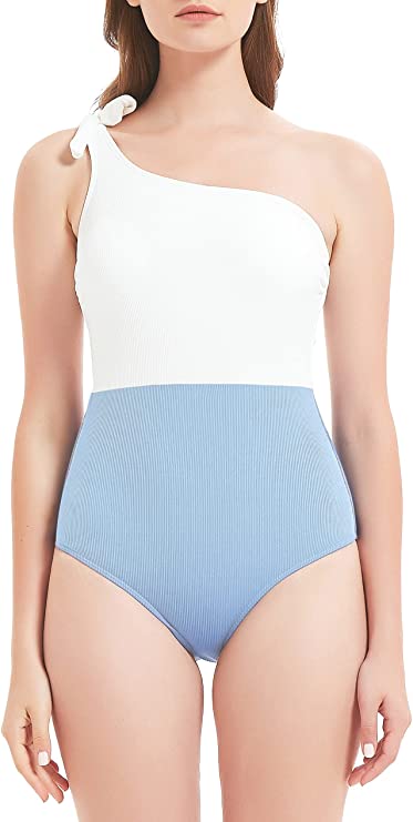 Annbon Women’s Ribbed One Piece Swimsuit Color Block One Shoulder Bowknot Bathing Suit