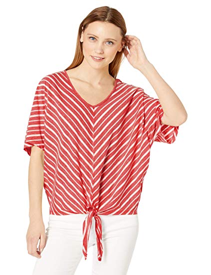 Short sleeve v-neck top with tie front and biased stripe, wide sleeve