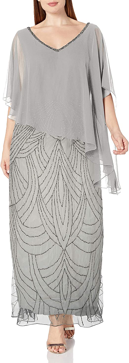 Plus V-neck , A-line silhouette w capelet gown with embellishment all over bottom skirt