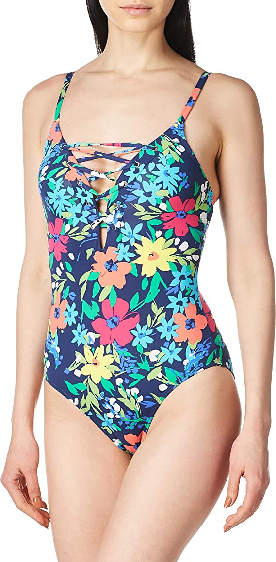 Nautica mini stripe grommet lace-up neckline one piece swimsuit