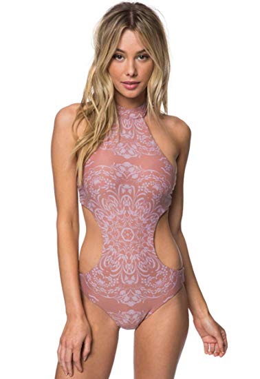 Cheeky coverage printed tactel one piece, center front shirring, grommet lace up back, clean finish, removable bra pads, metal logo badge.