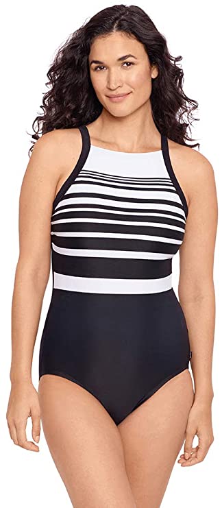 Become a true icon in this striped one piece from Reebok. The high neck style is so comfortable, with a supportive fit in the bust and wide tank straps that don’t dig in or pinch. Plus they’re adjustable and allow you to find the perfect fit every time. You can go from the beach to the pool and anywhere in between with total confidence. The solid colored bottom offers a nice contrast and has the bonus of smoothing out trouble spots in your lower half.