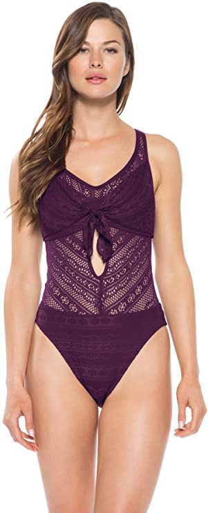 Over the shoulder one piece swimsuit features sheer insets, layered tie at bust, mitered front, and high leg cut. Offers removable soft cups, adjustable tie at back, and adjustable straps. Exclusive, luxury stretch fabrics and prints resist losing shape or vibrancy and provide opaque coverage. Native to California, Rebecca Virtue creates exquisite one of kind styles that show off and flatter the female form while providing the perfect fit.