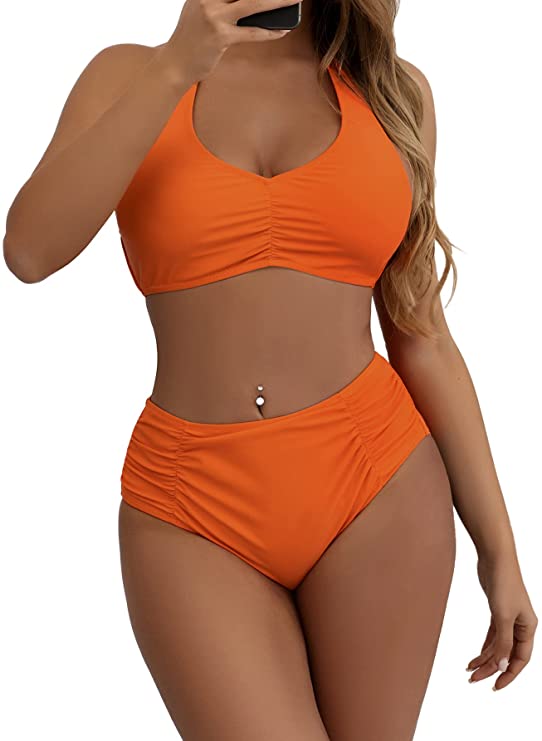The bikini top with adjustable halter shoulder straps design , strap made of high-quality material, sufficient elasticity. The ruched two pieces set covers part of the belly.