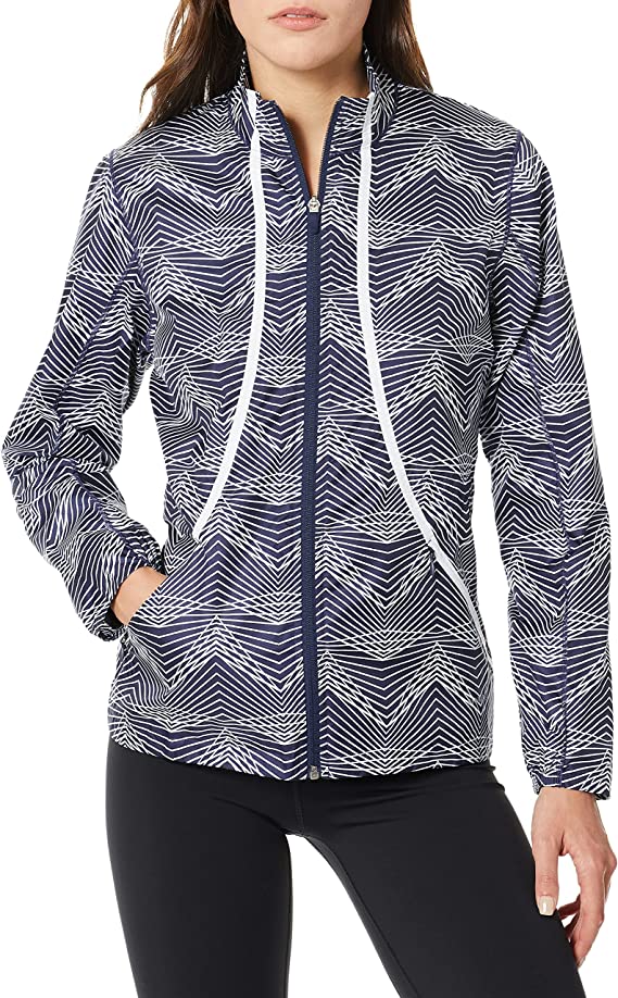 This weathertec quiet packable print long sleeve full zip jacket is a wind and water resistant mock collar full zip jacket. It has contrast tape design line front and back body with front on seam pockets. It has a inside draw cord at waist and is made from light, quiet packable fabric.