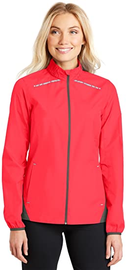 With eye-catching reflective hits and colorblocking details, this unlined jacket has a smooth hand along with wind- and water-resistance.100% polyester shellZip-through cadet collar with partial ruchingSet-in sleevesOpen front pocketsElastic binding at cuffs and hem