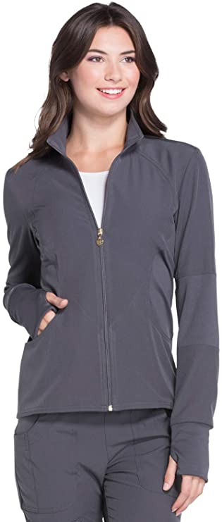 A Contemporary fit, zip front warm-up jacket has rib knit side panels, elbow panels and cuffs. Also featured are front pockets; front and back princess seams; and signature woven neck tape, triple-heart heat transfer and heart grommet detail